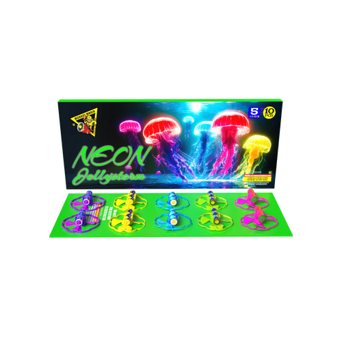 A dramatically neon-colored 200g cake featuring a combined I & V fan shooting pattern. Color strobe tails rise to white, green, and gold strobes with vibrant bursts of purple, cyan, lemon, orange, pigeon blood red, green, blue, and gold. Finishes with a bold 3-shot finale — really spectacular!